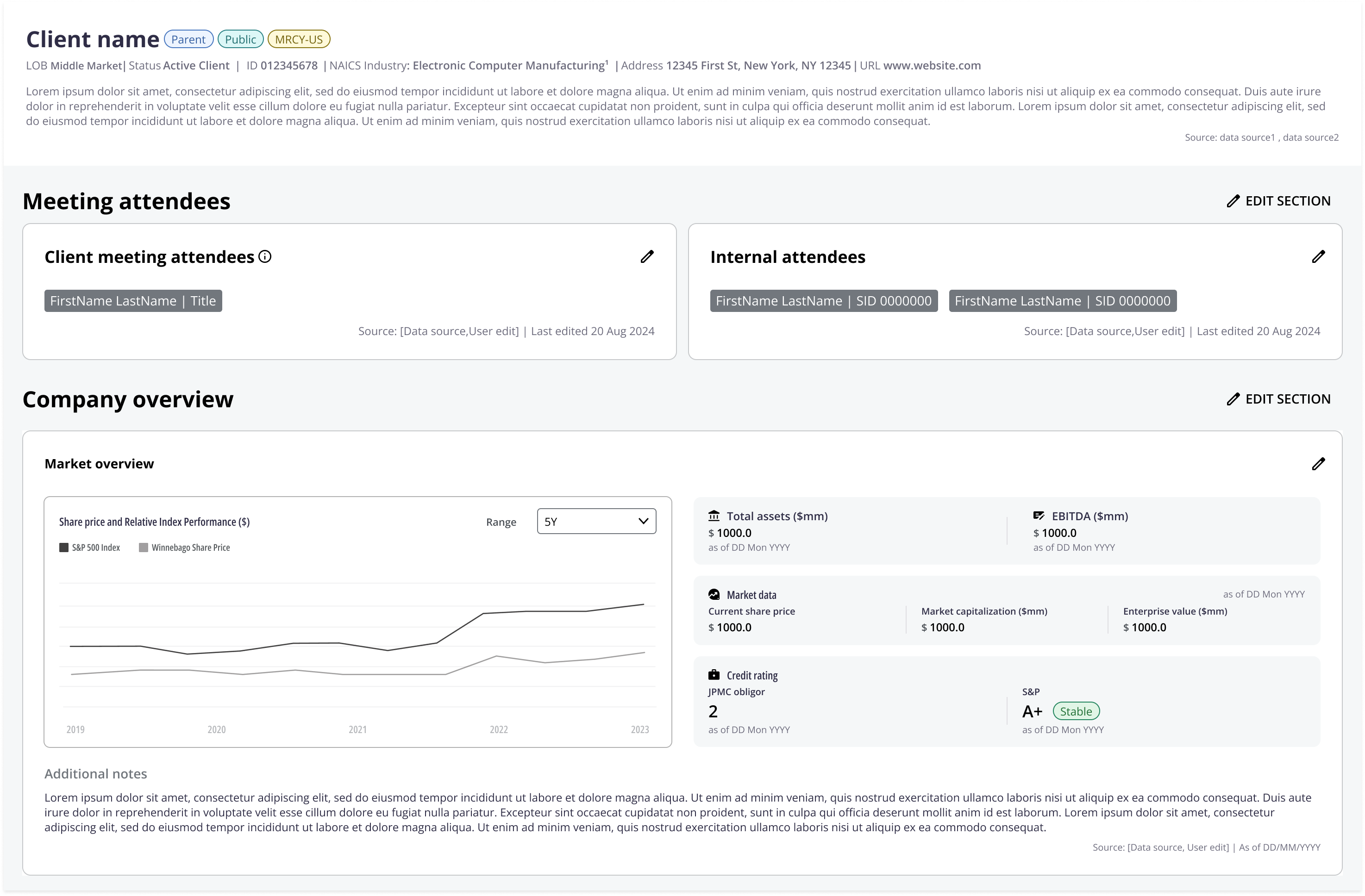 Consolidated 150+ client data fields from over 15 APIs to provide a unified view of the client, their relationship with the firm, and industry insights.